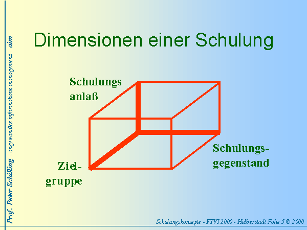 Der Bereich Schulung läßt sich nach dem Schulungsgegenstand, der Zielgruppe und dem Schulungszweck bzw. -anlass unterscheiden. In diesen “Problemraum” läßt sich m.E. jede Schulungsaufgabe einordnen. Zuerst werden diese drei wesentlichen Dimensionen im Überblick vorgestellt: