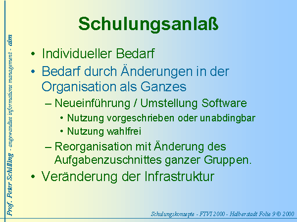 Der Schulungsanlaß ist zu untergliedern nach individuell geprägtem Bedarf und Anforderung durch Maßnahmen der Organisation als ganzes: