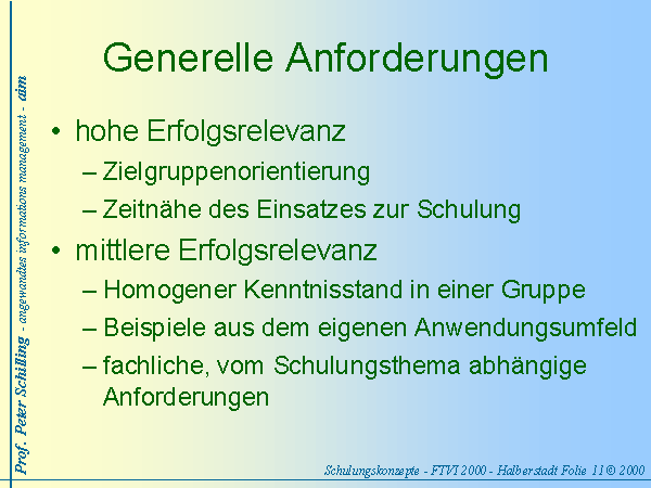 Schulung mit Fallbeispielen aus dem eigenen Aufgabengebiet und mit eindeutigem Schwerpunkt auf den im Tagesgeschäft benützten Funktionen. Bei Führungspersonal Schwerpunkt auf Vermittlung der Auswirkungen auf die eigene Rolle; bei Softwareschulung auf der prinzipiellen Funktion, nicht der einzelnen Beidienfunktionen, die sie selbst nicht benutzen.