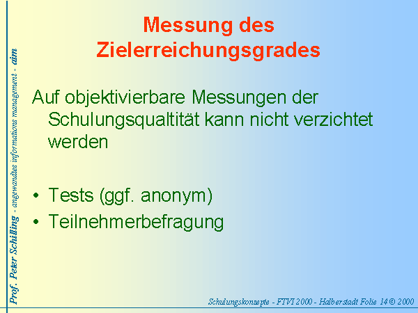 Die Messung des Zielerreichungsgrades einer Schulung ist ein wichtiger Teil sowohl der Qualitätssicherung als auch des Controlling. Den Vorbehalten gegen Tests kann dadurch teilweise Rechnung getragen werden, daß die Ergebnisse nur in anonymisierter Form vom Auftraggeber ausgewertet werden. Die Einzelergebnisse dienen nur dem Teilnehmer zur eigenen Kontrolle. Die Entwicklung aussagefähiger Tests sowie das Ablegen, die Anonymisierung und die Auswertung der Tests bedeutet einen beträchtlichen Zusatzaufwand. Bei Standardangeboten z.B. für gängige Endanwender-Software ist er m.E. auf jeden Fall zu leisten. Durch die hohe Wiederholrate überwiegt auf jeden Fall der Nutzen. Man bei einmaligen Schulungen z.B. im Zuge von Umstellungsmaßnahmen ganz auf sie verzichten oder sich auf repräsentative Stichproben beschränken. Es wird m.E. noch einige Zeit dauern, bis sich in der öffentlichen Verwaltung die Erkenntnis durchsetzen wird, daß diese Art der Qualitätssicherung auch im wohlverstandenen Interesse der Teilnehmer liegt.