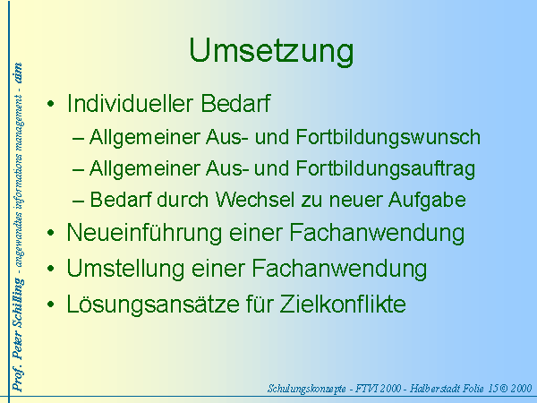 Dieser Bereich kann weiter untergliedert werden. Hier sollen einige Aspekte näher beleuchtet werden, die eine hohe Verallgemeinerungsfähigkeit haben. Auch hier werden vor allem solche Aspekte betrachtet, die m.E. in der Diskussion des Themas Schulung bisher eine zu geringe Beachtung finden. Soweit keine ausdrückliche Einschränkung gemacht wird, beziehen sich die Ausführungen sowohl auf den Bereich der Ausbildung zur Berufsqualifizierung als auch auf den Fortbildungs- und Umschulungsbereich.