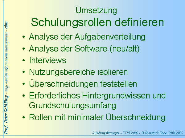 Der Zuschnitt von Schulungsrollen/-bausteinen kann ermittelt werden durch Analyse der Arbeitsabläufe; z.B. auf der Basis von Arbeitsanweisungen und Geschäftsverteilungsplänen. Die Arbeitsabläufe werden zu den Funktionalitäten des Programms aus Anwendersicht (Menues, Masken, etc.) in Beziehung gesetzt. Dies kann durch Interviews mit typischen Anwendern ergänzt werden. Dies ist insbesondere dann zu empfehlen, wenn Unsicherheiten bei der Abgrenzung der benützten Funktionalitäten bestehen.